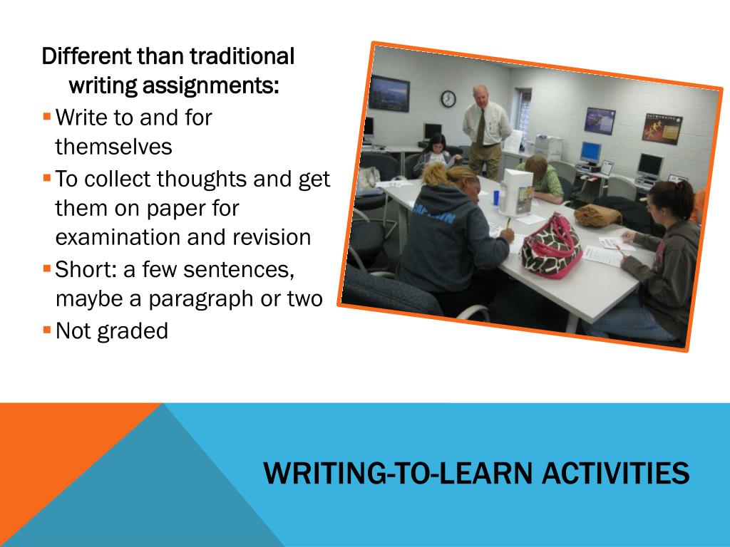 Writing-to-learn activities • Different than traditional writing assignments: • Write to and for themselves • To collect thoughts and get them on paper for examination and revision • Short: a few sentences, maybe a paragraph or two • Not graded