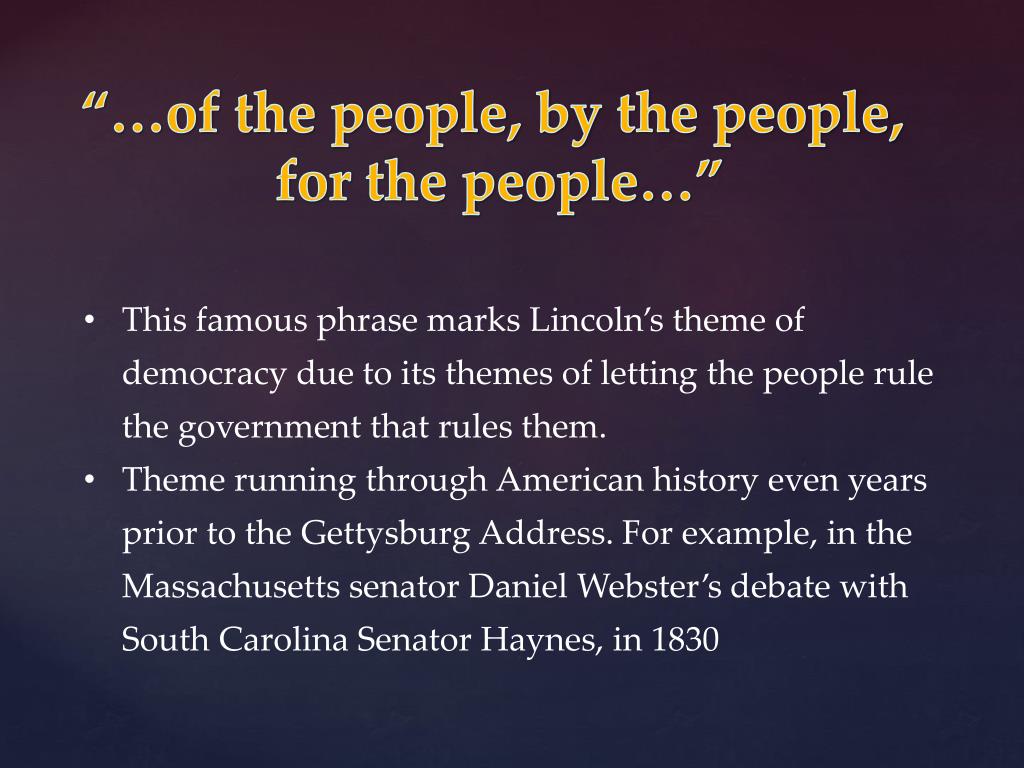 “…of the people, by the people, for the people…” • This famous phrase marks Lincoln’s theme of democracy due to its themes of letting the people rule the government that rules them. • Theme running through American history even years prior to the Gettysburg Address. For example, in the Massachusetts senator Daniel Webster’s debate with South Carolina Senator Haynes, in 1830