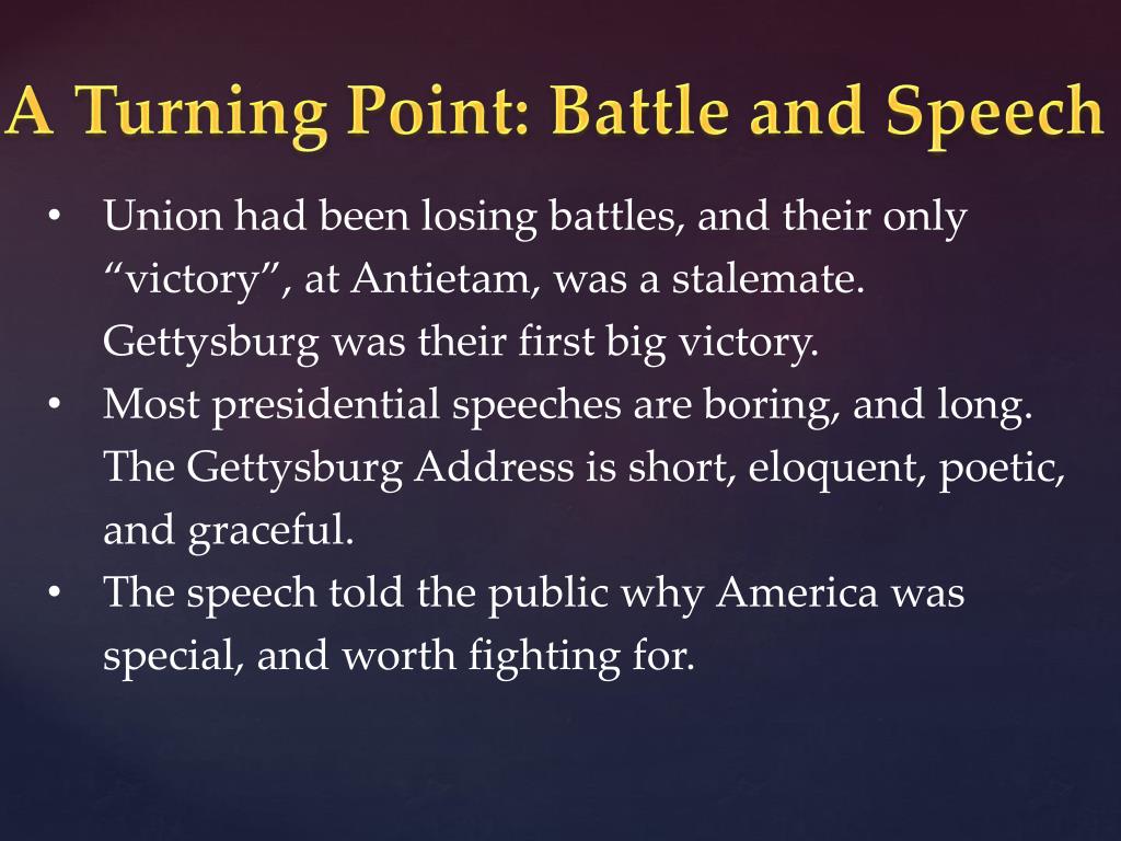 A Turning Point: Battle and Speech • Union had been losing battles, and their only “victory”, at Antietam, was a stalemate. Gettysburg was their first big victory. • Most presidential speeches are boring, and long. The Gettysburg Address is short, eloquent, poetic, and graceful. • The speech told the public why America was special, and worth fighting for.