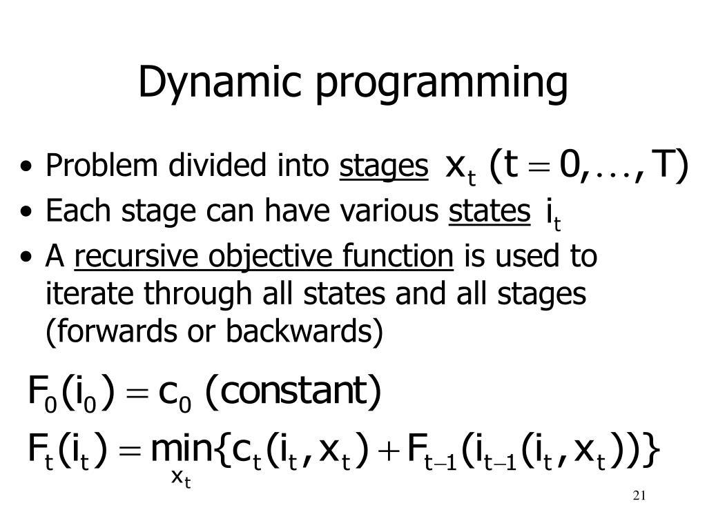 Dynamic programming • Problem divided into stages • Each stage can have various states • A recursive objective function is used to iterate through all states and all stages (forwards or backwards)