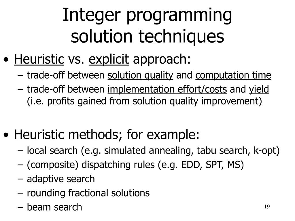 Integer programmingsolution techniques • Heuristic vs. explicit approach: • trade-off between solution quality and computation time • trade-off between implementation effort/costs and yield (i.e. profits gained from solution quality improvement) • Heuristic methods; for example: • local search (e.g. simulated annealing, tabu search, k-opt) • (composite) dispatching rules (e.g. EDD, SPT, MS) • adaptive search • rounding fractional solutions • beam search