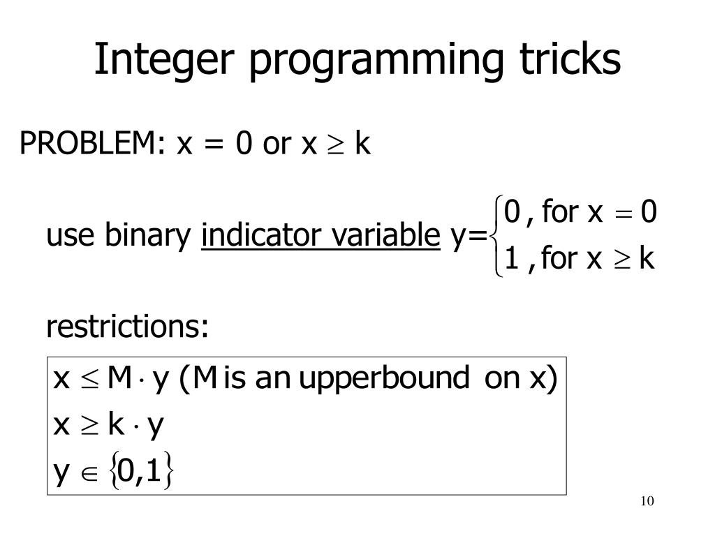 Integer programming tricks (2) PROBLEM: fixed costs: if xi>0 then costs C(xi) use indicator variable yi= restrictions :
