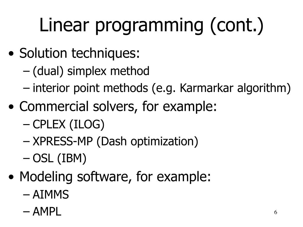 Linear programming (cont.) • Solution techniques: • (dual) simplex method • interior point methods (e.g. Karmarkar algorithm) • Commercial solvers, for example: • CPLEX (ILOG) • XPRESS-MP (Dash optimization) • OSL (IBM) • Modeling software, for example: • AIMMS • AMPL