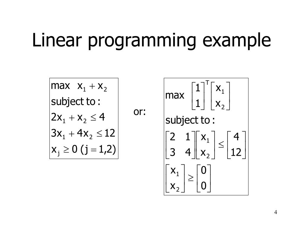 Linear programming (LP) model objective function • LP: • Matrix form: constraints variable restrictions where: x, c: n-vector A: m,n-matrix b: m-vector