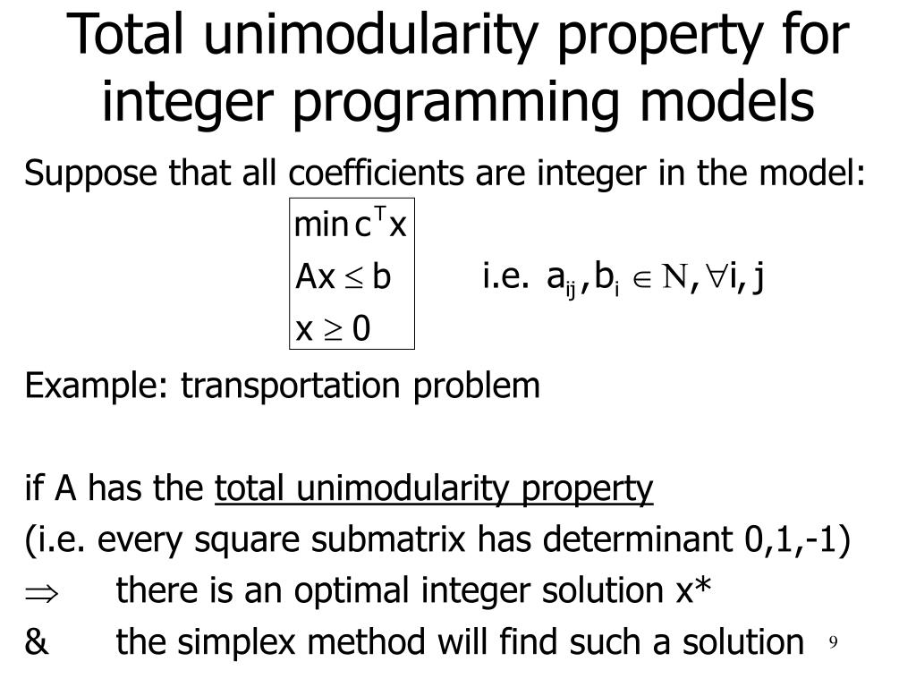Total unimodularity property for integer programming models Suppose that all coefficients are integer in the model: i.e. Example: transportation problem if A has the total unimodularity property (i.e. every square submatrix has determinant 0,1,-1) Þ there is an optimal integer solution x* & the simplex method will find such a solution