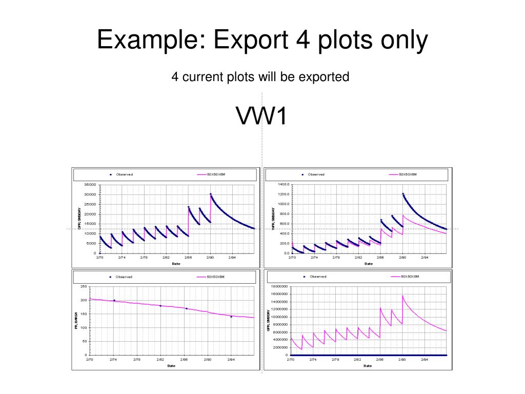 Create/Add ppt • Plots for all wells can be transferred to MS powerpoint at one. User has several option for exporting. The result will be shown in next slides. • MS powerpoint must be opened before exporting. • In addition, current 4 plot can be added to the end of active powerpoint presentation. • Data shown in all plot can be copied to clipboard. • Add plot to powerpoint presentation and copy data to clipboard will work in the same manner in other modules.