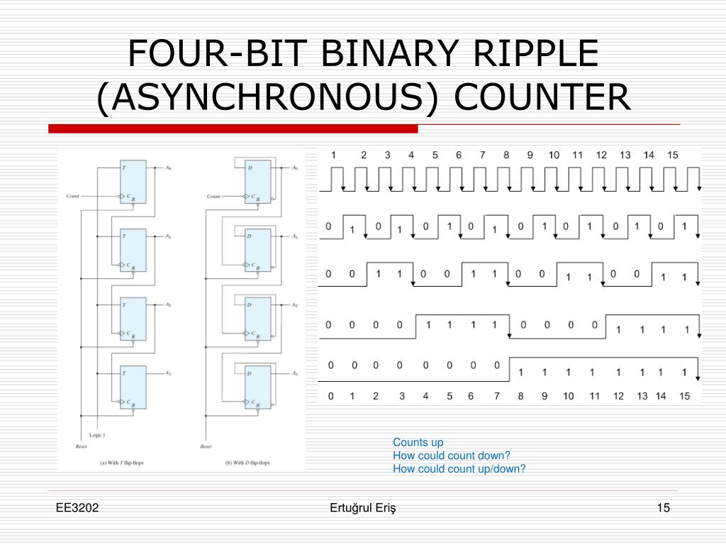 FOUR-BIT BINARY RIPPLE (ASYNCHRONOUS) COUNTER Counts up How could count down? How could count up/down? Ertuğrul Eriş