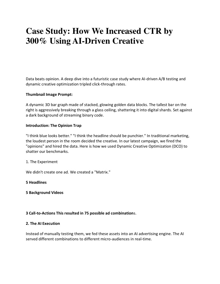 Case Study: How We Increased CTR by 300% Using AI-Driven Creative Data beats opinion. A deep dive into a futuristic case study where AI-driven A/B testing and dynamic creative optimization tripled click-through rates. Thumbnail Image Prompt: A dynamic 3D bar graph made of stacked, glowing golden data blocks. The tallest bar on the right is aggressively breaking through a glass ceiling, shattering it into digital shards. Set against a dark background of streaming binary code. Introduction: The Opinion Trap "I think blue looks better." "I think the headline should be punchier." In traditional marketing, the loudest person in the room decided the creative. In our latest campaign, we fired the "opinions" and hired the data. Here is how we used Dynamic Creative Optimization (DCO) to shatter our benchmarks. 1. The Experiment We didn't create one ad. We created a "Matrix." 5 Headlines 5 Background Videos 3 Call-to-Actions This resulted in 75 possible ad combinations. 2. The AI Execution Instead of manually testing them, we fed these assets into an AI advertising engine. The AI served different combinations to different micro-audiences in real-time.