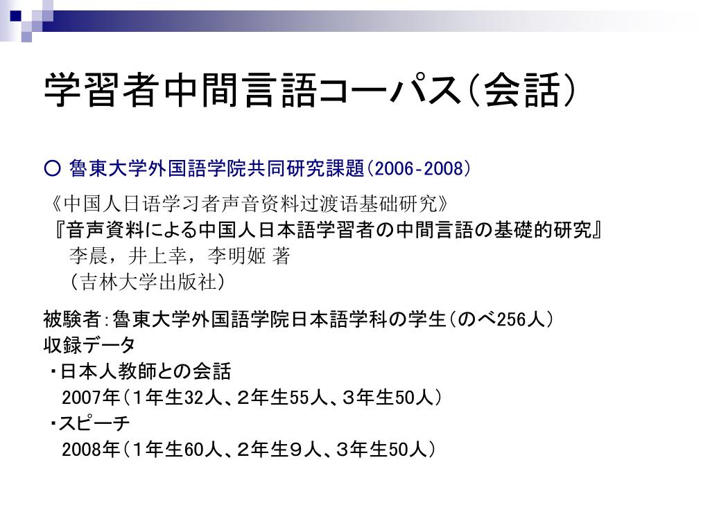 学習者中間言語コーパス(会話) ○ 魯東大学外国語学院共同研究課題(2006‐2008) 《中国人日语学习者声音资料过渡语基础研究》 『音声資料による中国人日本語学習者の中間言語の基礎的研究』 李晨,井上幸,李明姬 著 (吉林大学出版社) 被験者:魯東大学外国語学院日本語学科の学生(のべ256人) 収録データ ・日本人教師との会話 2007年(1年生32人、2年生55人、3年生50人) ・スピーチ 2008年(1年生60人、2年生9人、3年生50人)