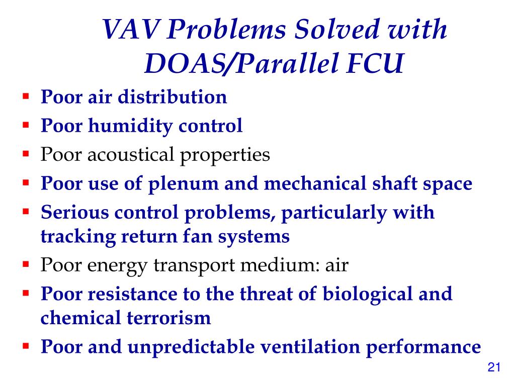 VAV Problems Solved with DOAS/Parallel FCU • Poor air distribution • Poor humidity control • Poor acoustical properties • Poor use of plenum and mechanical shaft space • Serious control problems, particularly with tracking return fan systems • Poor energy transport medium: air • Poor resistance to the threat of biological and chemical terrorism • Poor and unpredictable ventilation performance