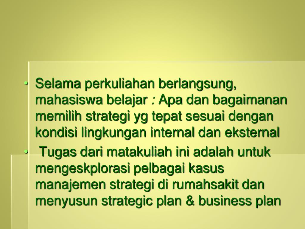 Selamaperkuliahanberlangsung, mahasiswabelajar:Apadanbagaimananmemilihstrategiygtepatsesuaidengankondisilingkungan internal daneksternal • Tugasdarimatakuliahiniadalahuntukmengeskplorasipelbagaikasusmanajemenstrategidirumahsakitdanmenyusun strategic plan & business plan