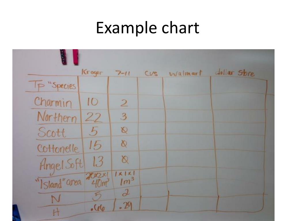 Shannon-Weiner Example. Grocery Store Lab. Example chart. Formulas for “N” and “H”. p i =the decimal numbers…see next slide. Calculating the decimals to be used in S-W problems. Calculating S-W (“H” for Kroger). “H” for 7-11.