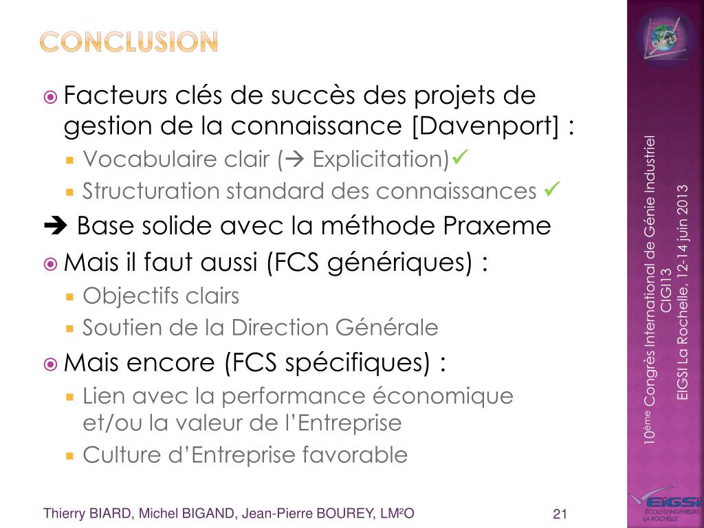 Conclusion • Facteurs clés de succès des projets de gestion de la connaissance [Davenport] : • Vocabulaire clair ( Explicitation) • Structuration standard des connaissances Base solide avec la méthode Praxeme • Mais il faut aussi (FCS génériques) : • Objectifs clairs • Soutien de la Direction Générale • Mais encore (FCS spécifiques) : • Lien avec la performance économiqueet/ou la valeur de l’Entreprise • Culture d’Entreprise favorable Thierry BIARD, Michel BIGAND, Jean-Pierre BOUREY, LM²O