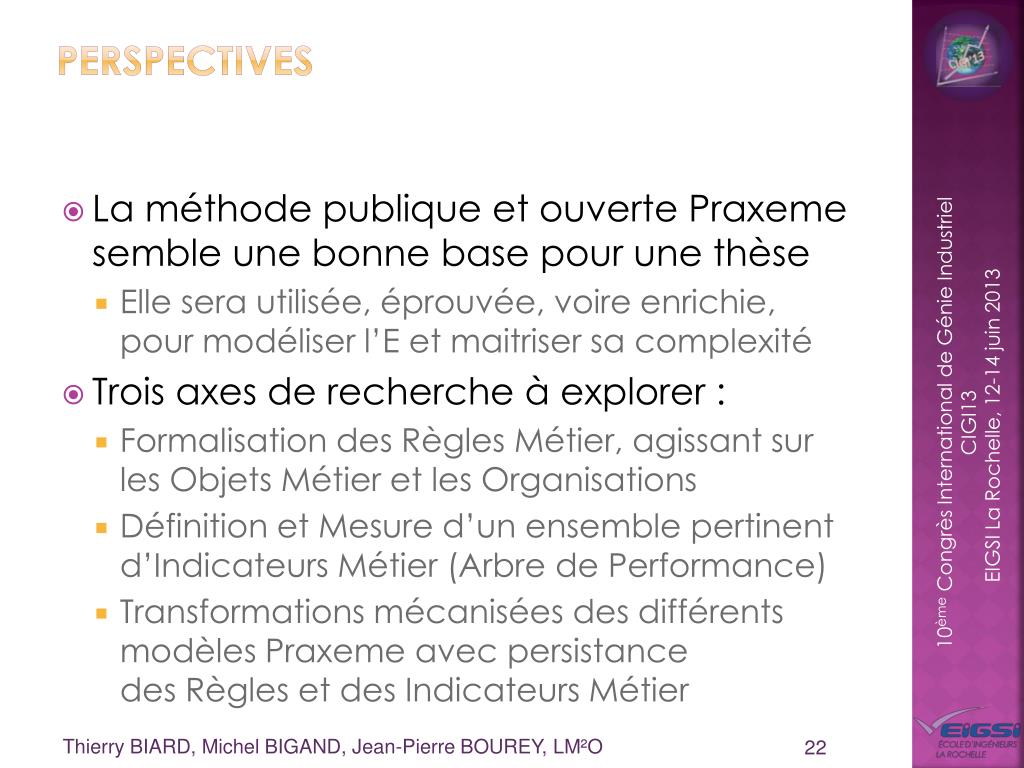 Perspectives • La méthode publique et ouverte Praxeme semble une bonne base pour une thèse • Elle sera utilisée, éprouvée, voire enrichie, pour modéliser l’E et maitriser sa complexité • Trois axes de recherche à explorer : • Formalisation des Règles Métier, agissant sur les Objets Métier et les Organisations • Définition et Mesure d’un ensemble pertinent d’Indicateurs Métier(Arbre de Performance) • Transformations mécanisées des différents modèles Praxeme avec persistancedes Règles et des Indicateurs Métier Thierry BIARD, Michel BIGAND, Jean-Pierre BOUREY, LM²O