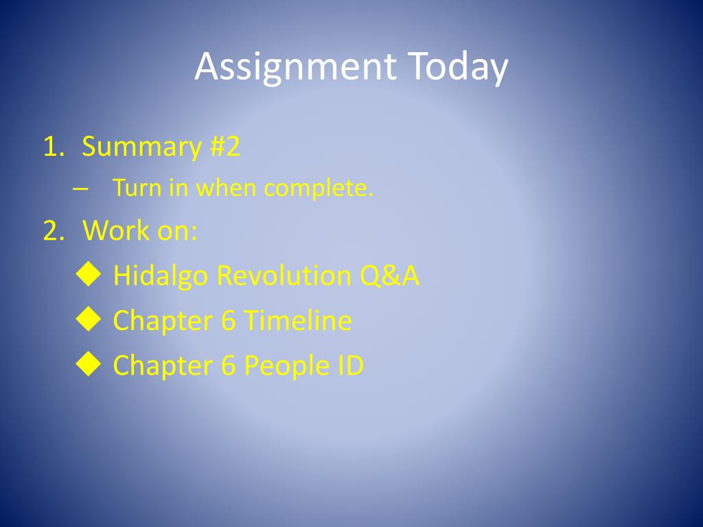 Assignment Today • Summary #2 • Turn in when complete. • Work on: • Hidalgo Revolution Q&A • Chapter 6 Timeline • Chapter 6 People ID