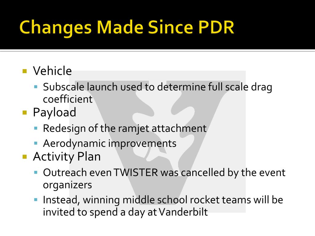 Changes Made Since PDR • Vehicle • Subscale launch used to determine full scale drag coefficient • Payload • Redesign of the ramjet attachment • Aerodynamic improvements • Activity Plan • Outreach even TWISTER was cancelled by the event organizers • Instead, winning middle school rocket teams will be invited to spend a day at Vanderbilt