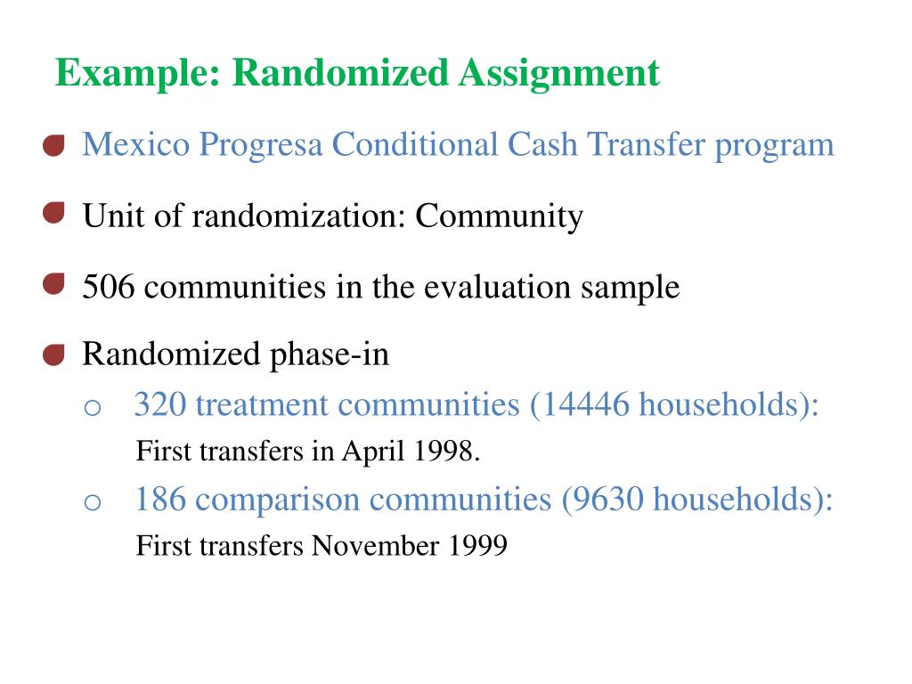 Example: Randomized Assignment • Mexico Progresa Conditional Cash Transfer program • Unit of randomization: Community • 506 communities in the evaluation sample • Randomized phase-in • 320 treatment communities (14446 households): • First transfers in April 1998. • 186 comparison communities (9630 households): • First transfers November 1999