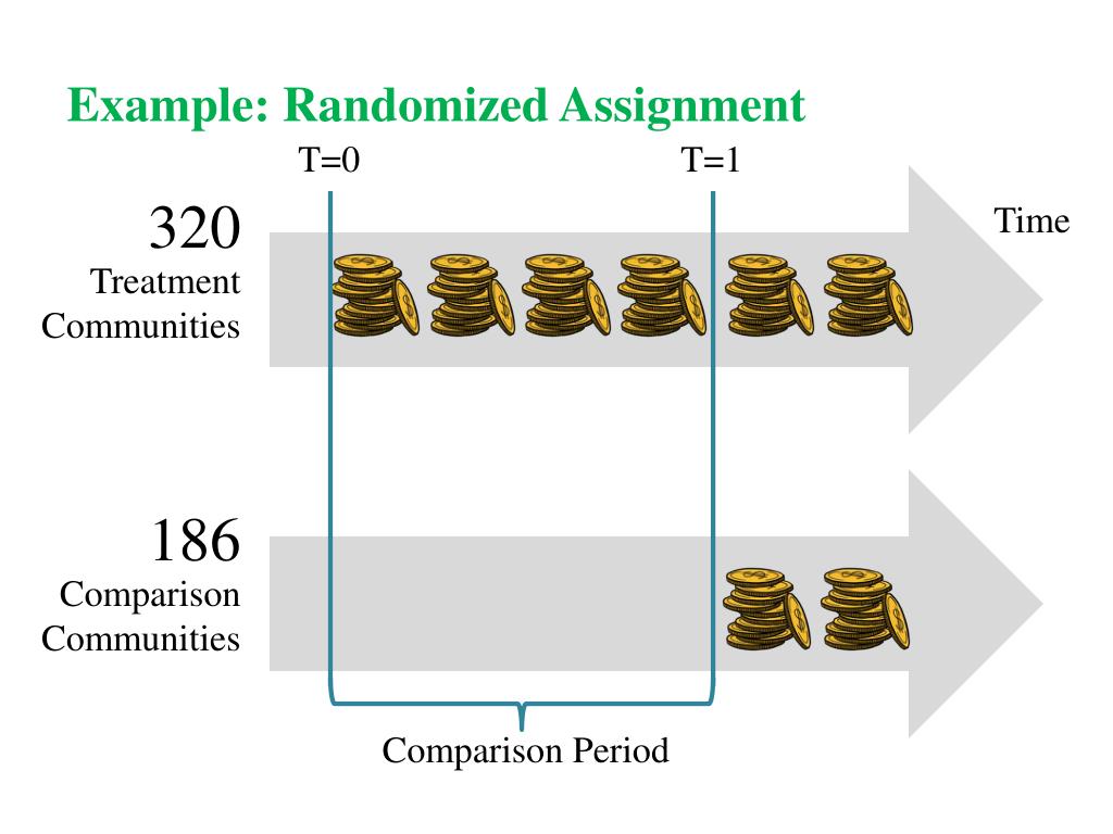 Example: Randomized Assignment • T=0 • T=1 • 320 • Time • Treatment Communities • 186 • Comparison Communities • Comparison Period