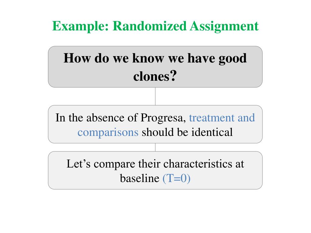How do we know we have good clones? In the absence of Progresa, treatment and comparisons should be identical Let’s compare their characteristics at baseline (T=0) Example: Randomized Assignment