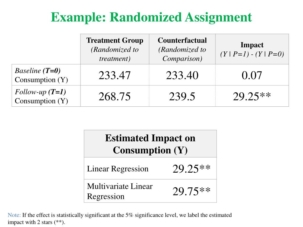 Example: Randomized Assignment Note: If the effect is statistically significant at the 5% significance level, we label the estimated impact with 2 stars (**).