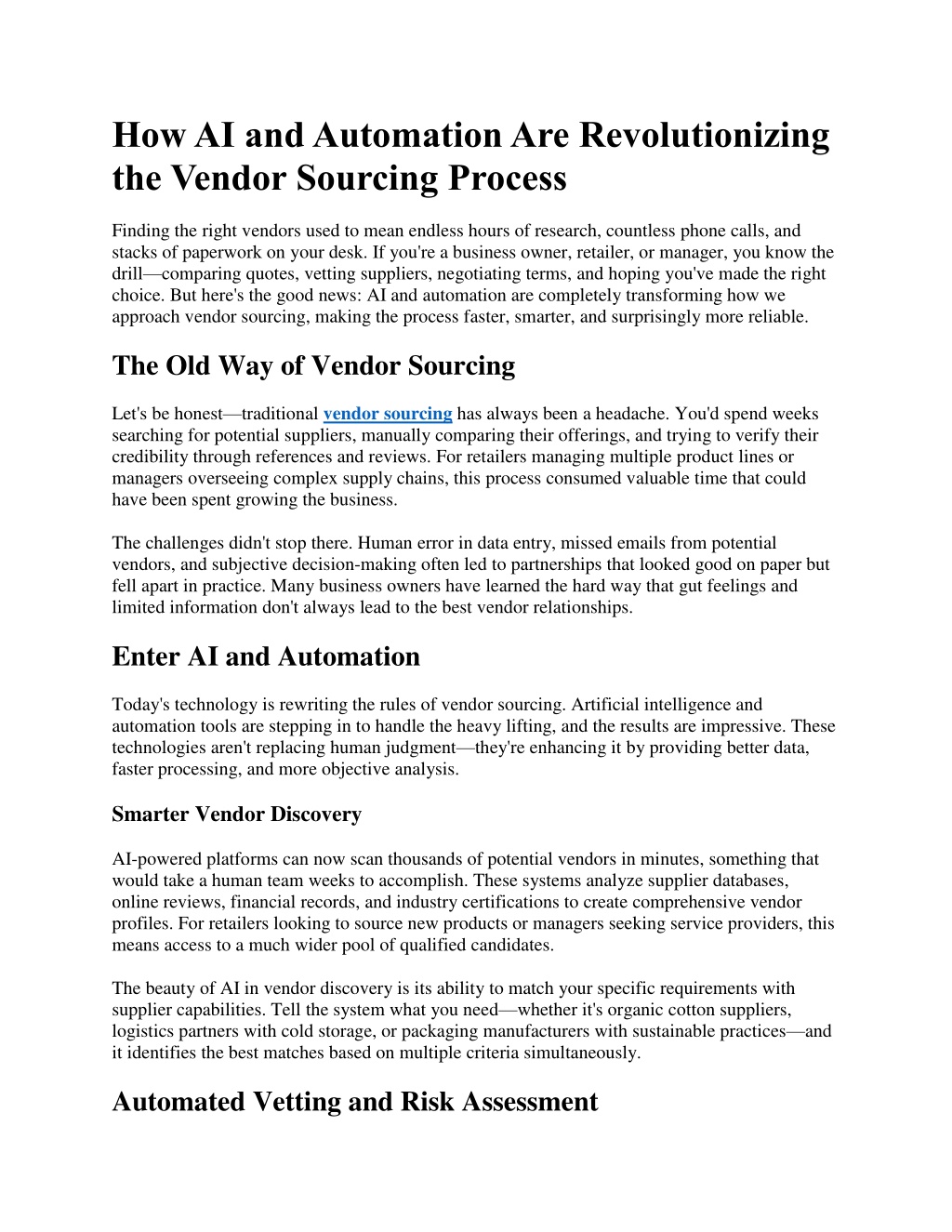 How AI and Automation Are Revolutionizing the Vendor Sourcing Process Finding the right vendors used to mean endless hours of research, countless phone calls, and stacks of paperwork on your desk. If you're a business owner, retailer, or manager, you know the drill—comparing quotes, vetting suppliers, negotiating terms, and hoping you've made the right choice. But here's the good news: AI and automation are completely transforming how we approach vendor sourcing, making the process faster, smarter, and surprisingly more reliable. The Old Way of Vendor Sourcing Let's be honest—traditional vendor sourcing has always been a headache. You'd spend weeks searching for potential suppliers, manually comparing their offerings, and trying to verify their credibility through references and reviews. For retailers managing multiple product lines or managers overseeing complex supply chains, this process consumed valuable time that could have been spent growing the business. The challenges didn't stop there. Human error in data entry, missed emails from potential vendors, and subjective decision-making often led to partnerships that looked good on paper but fell apart in practice. Many business owners have learned the hard way that gut feelings and limited information don't always lead to the best vendor relationships. Enter AI and Automation Today's technology is rewriting the rules of vendor sourcing. Artificial intelligence and automation tools are stepping in to handle the heavy lifting, and the results are impressive. These technologies aren't replacing human judgment—they're enhancing it by providing better data, faster processing, and more objective analysis. Smarter Vendor Discovery AI-powered platforms can now scan thousands of potential vendors in minutes, something that would take a human team weeks to accomplish. These systems analyze supplier databases, online reviews, financial records, and industry certifications to create comprehensive vendor profiles. For retailers looking to source new products or managers seeking service providers, this means access to a much wider pool of qualified candidates. The beauty of AI in vendor discovery is its ability to match your specific requirements with supplier capabilities. Tell the system what you need—whether it's organic cotton suppliers, logistics partners with cold storage, or packaging manufacturers with sustainable practices—and it identifies the best matches based on multiple criteria simultaneously. Automated Vetting and Risk Assessment