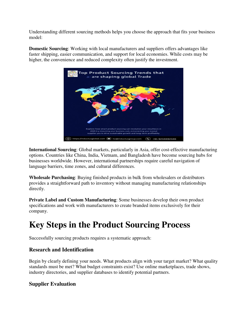 2. Understanding different sourcing methods helps you choose the approach that fits your business model: Domestic Sourcing: Working with local manufacturers and suppliers offers advantages like faster shipping, easier communication, and support for local economies. While costs may be higher, the convenience and reduced complexity often justify the investment. International Sourcing: Global markets, particularly in Asia, offer cost-effective manufacturing options. Countries like China, India, Vietnam, and Bangladesh have become sourcing hubs for businesses worldwide. However, international partnerships require careful navigation of language barriers, time zones, and cultural differences. Wholesale Purchasing: Buying finished products in bulk from wholesalers or distributors provides a straightforward path to inventory without managing manufacturing relationships directly. Private Label and Custom Manufacturing: Some businesses develop their own product specifications and work with manufacturers to create branded items exclusively for their company. Key Steps in the Product Sourcing Process Successfully sourcing products requires a systematic approach: Research and Identification Begin by clearly defining your needs. What products align with your target market? What quality standards must be met? What budget constraints exist? Use online marketplaces, trade shows, industry directories, and supplier databases to identify potential partners. Supplier Evaluation