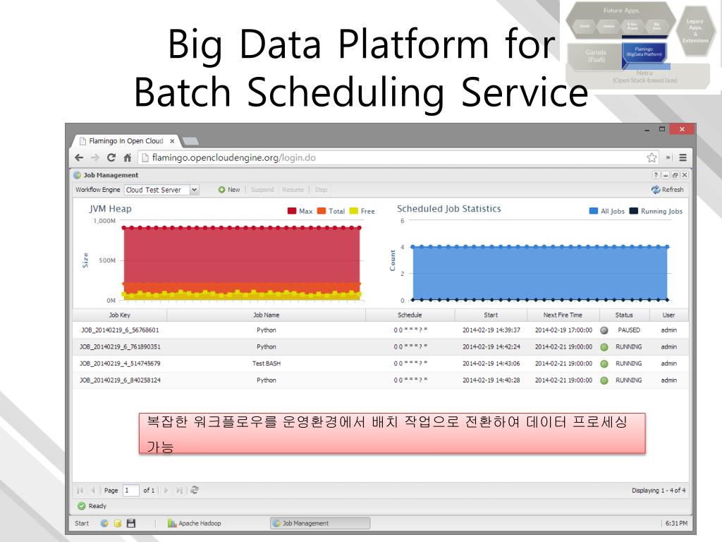 Big Data Platform forBatch Scheduling Service 복잡한 워크플로우를 운영환경에서 배치 작업으로 전환하여 데이터 프로세싱 가능