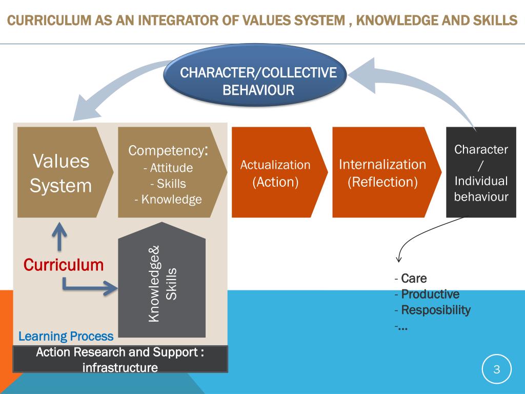 curriculum as an integrator of values system , knowledge and skills CHARACTER/COLLECTIVE BEHAVIOUR Learning Process Values System • Competency: • Attitude • Skills • Knowledge Actualization(Action) Internalization(Reflection) Character/ Individual behaviour Knowledge& Skills Curriculum • Care • Productive • Resposibility • ... Action Research and Support : infrastructure