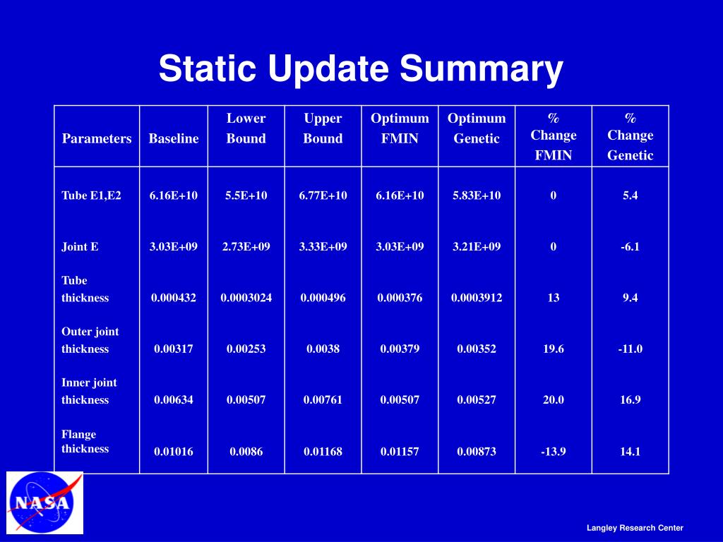 Concluding Remarks • Computational procedure using MATLAB in place • Initial updates completed using static and dynamic tests results • Updated solution for static case is in good agreement with test • Selected parameters for static analysis showed low output probability values when used to predict observed solution • Two step approach using output probabilities followed by optimization provides good physical insight into the problem • Dynamic test and analysis results need to be re-visited • Procedure computationally intensive but well suited for multi-processor systems