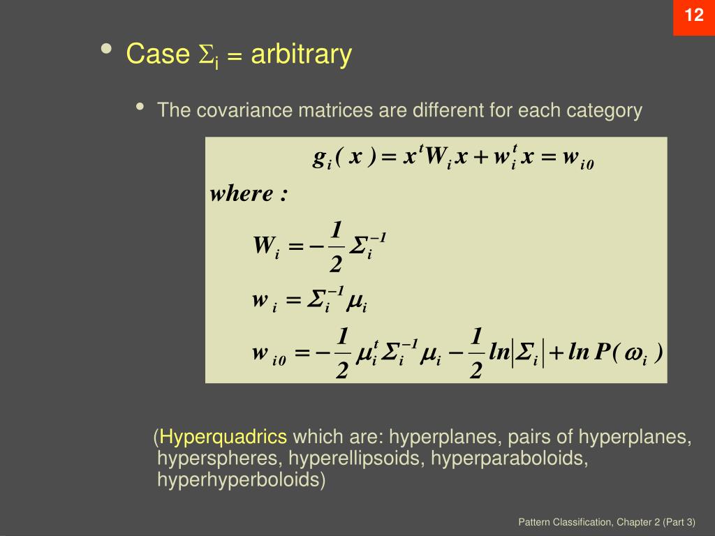 Case i = arbitrary • The covariance matrices are different for each category (Hyperquadrics which are: hyperplanes, pairs of hyperplanes, hyperspheres, hyperellipsoids, hyperparaboloids, hyperhyperboloids) Pattern Classification, Chapter 2 (Part 3)