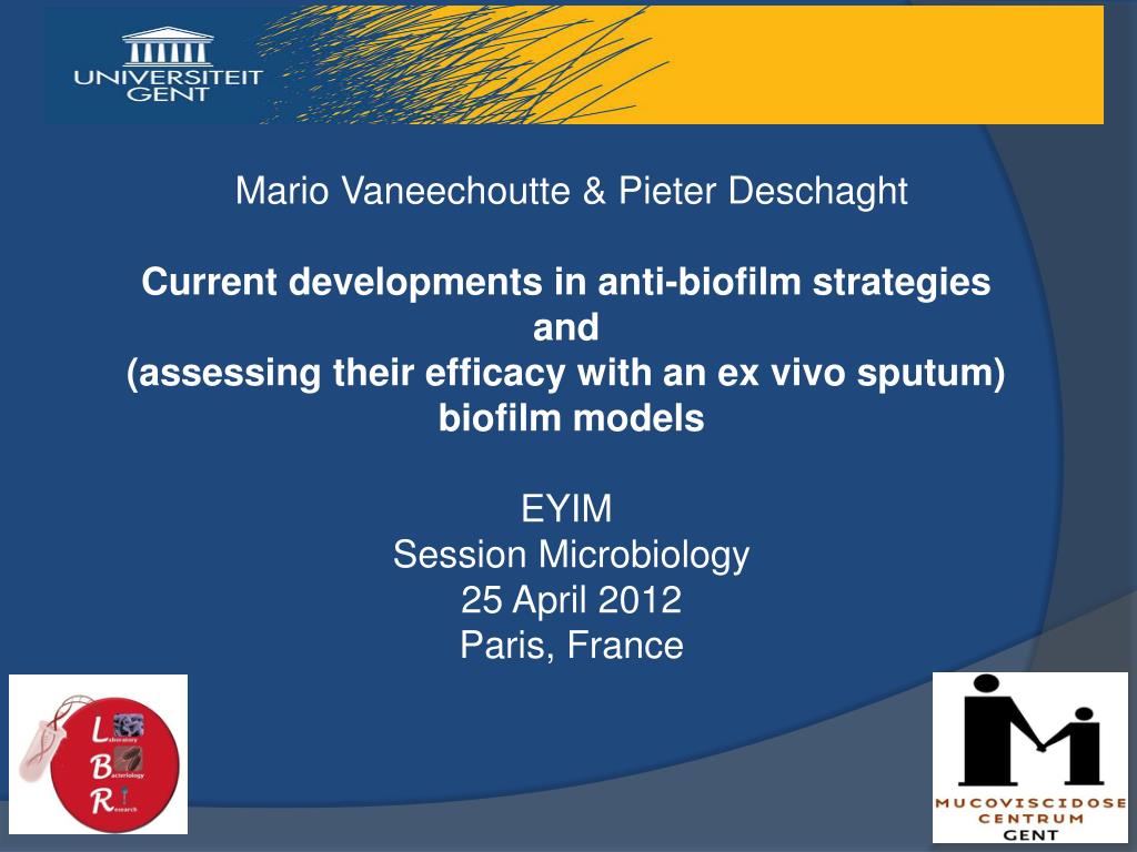 Mario Vaneechoutte & Pieter Deschaght Current developments in anti-biofilm strategies and (assessing their efficacy with an ex vivo sputum) biofilm models EYIM Session Microbiology 25 April 2012 Paris, France