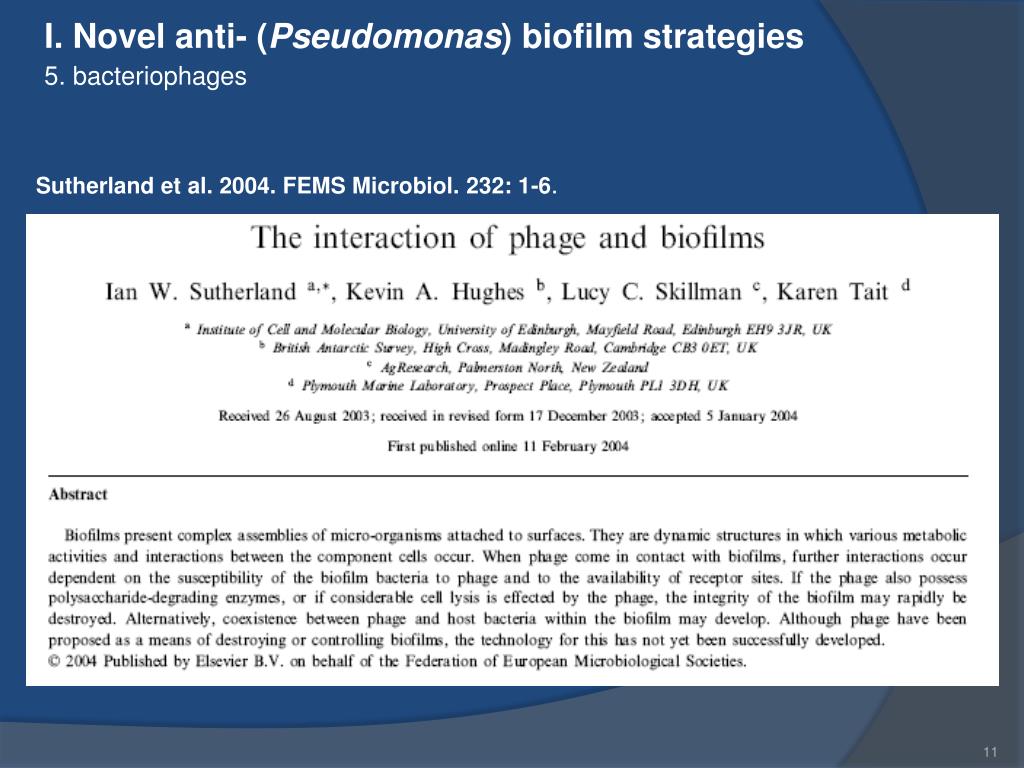 I. Novel anti- (Pseudomonas) biofilm strategies 5. bacteriophages Sutherland et al. 2004. FEMS Microbiol. 232: 1-6.