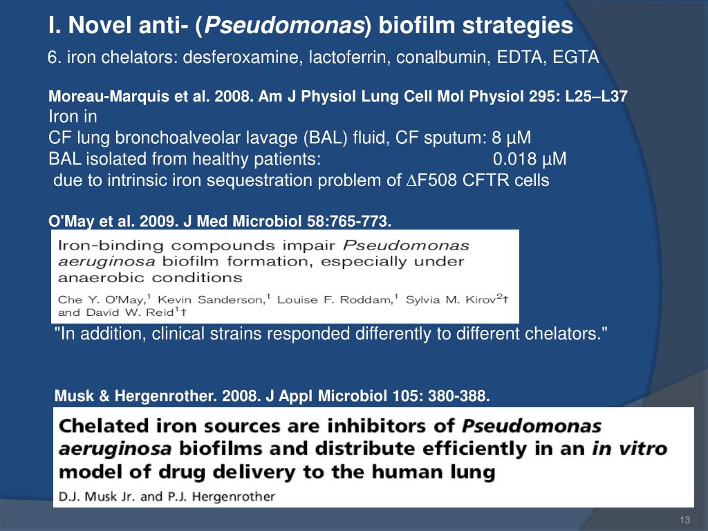 I. Novel anti- (Pseudomonas) biofilm strategies 6. iron chelators: desferoxamine, lactoferrin, conalbumin, EDTA, EGTA Moreau-Marquis et al. 2008. Am J Physiol Lung Cell Mol Physiol 295: L25–L37 Iron in CF lung bronchoalveolar lavage (BAL) fluid, CF sputum: 8 µM BAL isolated from healthy patients: 0.018 µM due to intrinsic iron sequestration problem of ∆F508 CFTR cells O'May et al. 2009. J Med Microbiol 58:765-773. "In addition, clinical strains responded differently to different chelators." Musk & Hergenrother. 2008. J Appl Microbiol 105: 380-388.