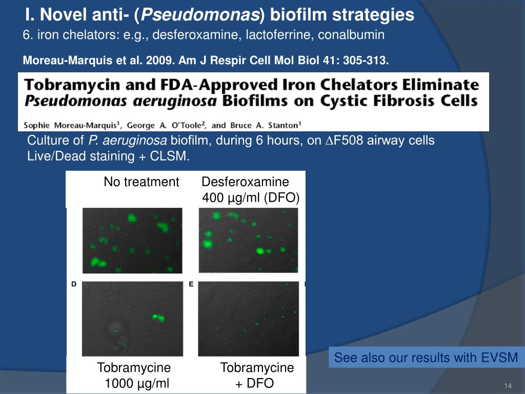 I. Novel anti- (Pseudomonas) biofilm strategies 6. iron chelators: e.g., desferoxamine, lactoferrine, conalbumin Moreau-Marquis et al. 2009. Am J Respir Cell Mol Biol 41: 305-313. Culture of P. aeruginosa biofilm, during 6 hours, on ∆F508 airway cells Live/Dead staining + CLSM. No treatment Desferoxamine 400 µg/ml (DFO) See also our results with EVSM Tobramycine Tobramycine 1000 µg/ml + DFO
