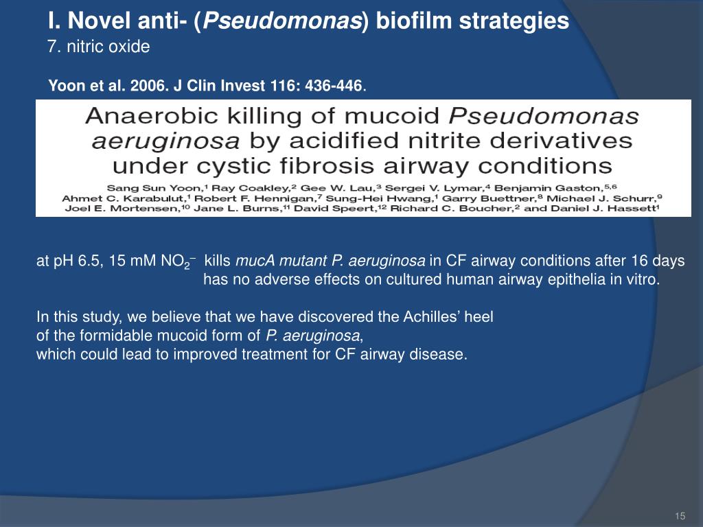 I. Novel anti- (Pseudomonas) biofilm strategies 7. nitric oxide Yoon et al. 2006. J Clin Invest 116: 436-446. at pH 6.5, 15 mM NO2– kills mucA mutant P. aeruginosa in CF airway conditions after 16 days has no adverse effects on cultured human airway epithelia in vitro. In this study, we believe that we have discovered the Achilles’ heel of the formidable mucoid form of P. aeruginosa, which could lead to improved treatment for CF airway disease.