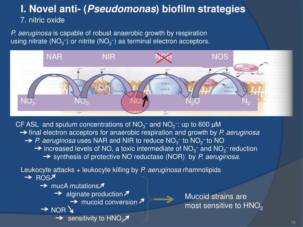 I. Novel anti- (Pseudomonas) biofilm strategies P. aeruginosa is capable of robust anaerobic growth by respiration using nitrate (NO3–) or nitrite (NO2–) as terminal electron acceptors. 7. nitric oxide CF ASL and sputum concentrations of NO3– and NO2–: up to 600 μM final electron acceptors for anaerobic respiration and growth by P. aeruginosa P. aeruginosa uses NAR and NIR to reduce NO3– to NO2– to NO increased levels of NO, a toxic intermediate of NO3– and NO2– reduction synthesis of protective NO reductase (NOR) by P. aeruginosa. NAR NIR NOR NOS Leukocyte attacks + leukocyte killing by P. aeruginosa rhamnolipids ROS mucA mutations alginate production mucoid conversion NOR sensitivity to HNO2 NO3- NO2- NO N2O N2 Mucoid strains are most sensitive to HNO2