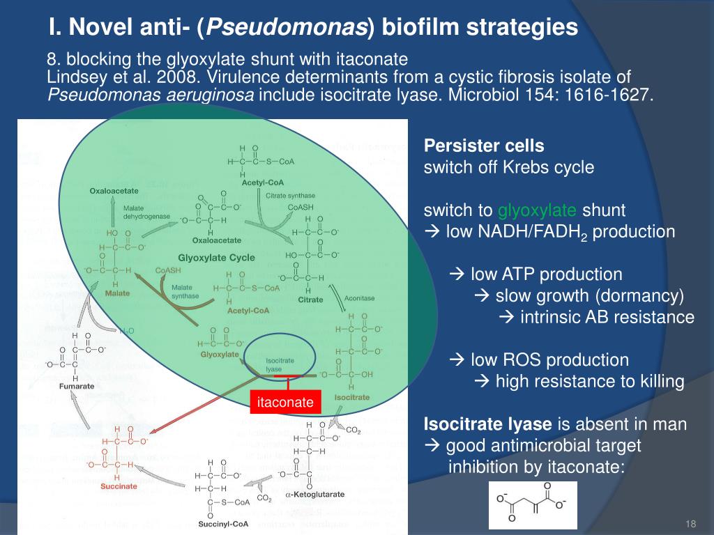 I. Novel anti- (Pseudomonas) biofilm strategies 8. blocking the glyoxylate shunt with itaconate Persister cells use the glyoxylate shunt instead of the Krebs cycle Krebs cycle reducing agents: NADH, FADH2 18 ATP rapid growth ROS Oxydative stress Bactericidal