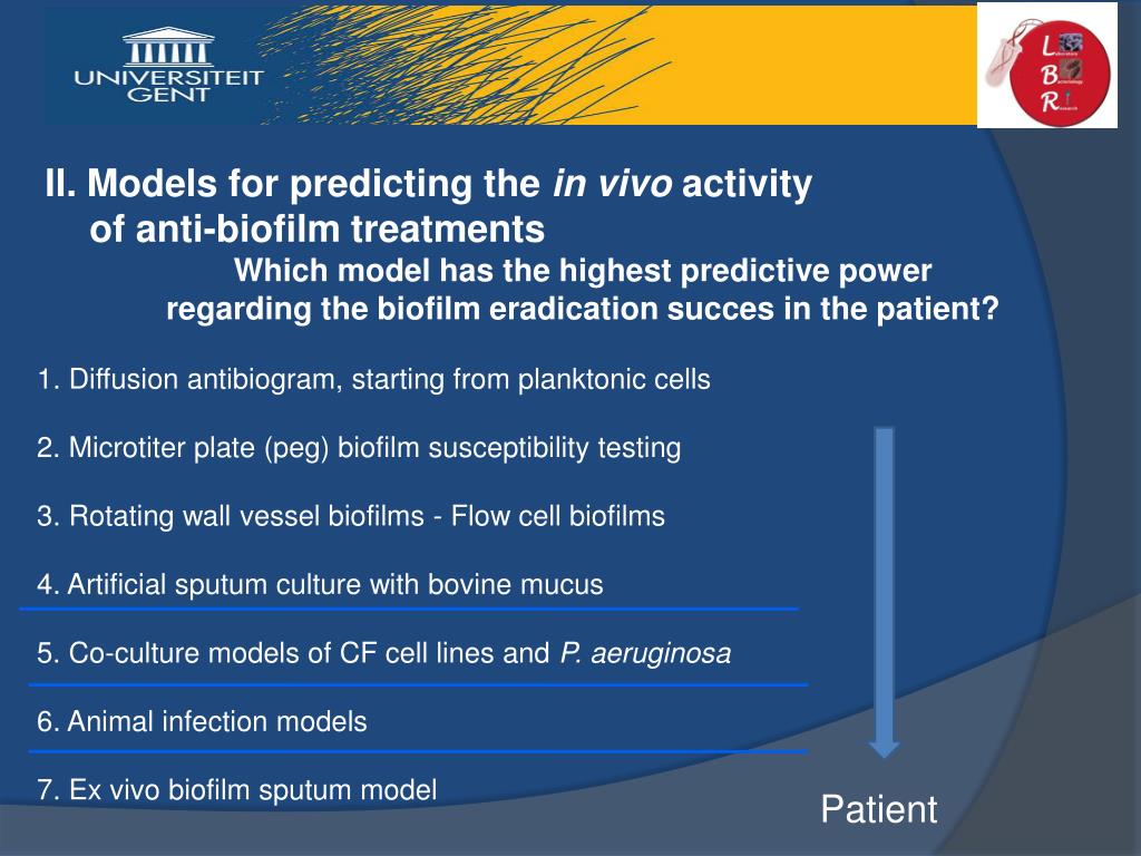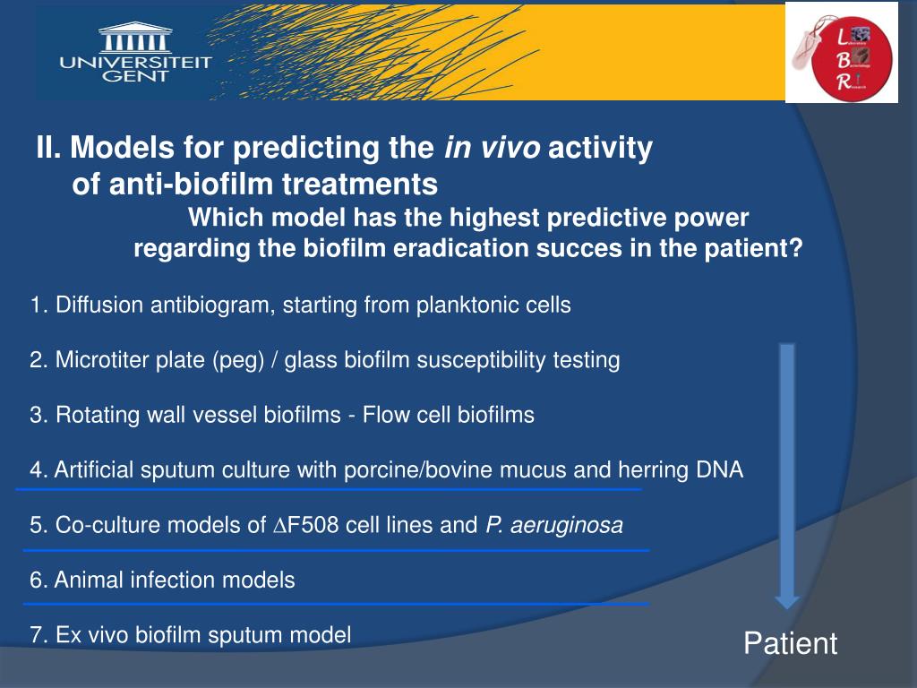II. Models for predicting the in vivo activity of anti-biofilm treatments Which model has the highest predictive power regarding the biofilm eradication succes in the patient? 1. Diffusion antibiogram, starting from planktonic cells 2. Microtiter plate (peg) biofilm susceptibility testing 3. Rotating wall vessel biofilms - Flow cell biofilms 4. Artificial sputum culture with bovine mucus 5. Co-culture models of CF cell lines and P. aeruginosa 6. Animal infection models 7. Ex vivo biofilm sputum model Patient