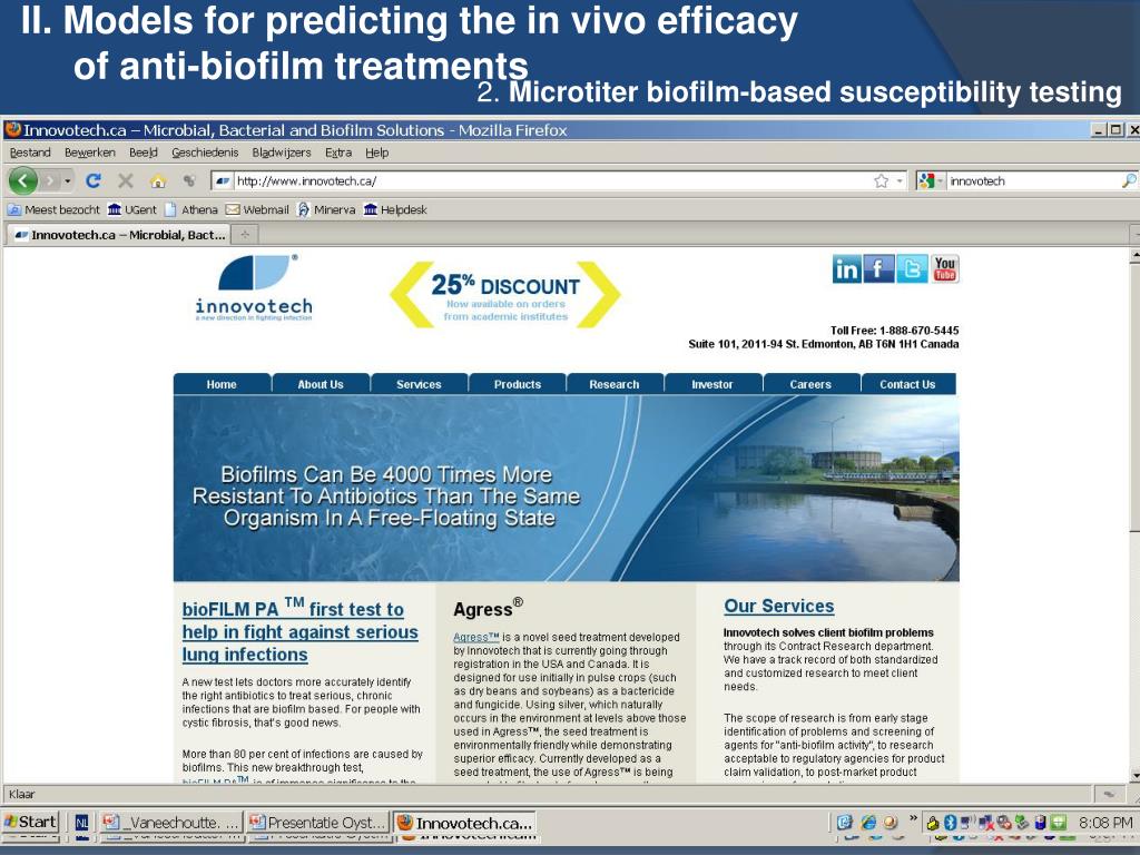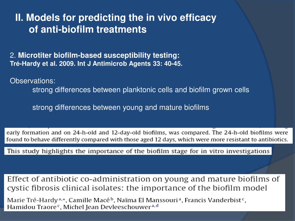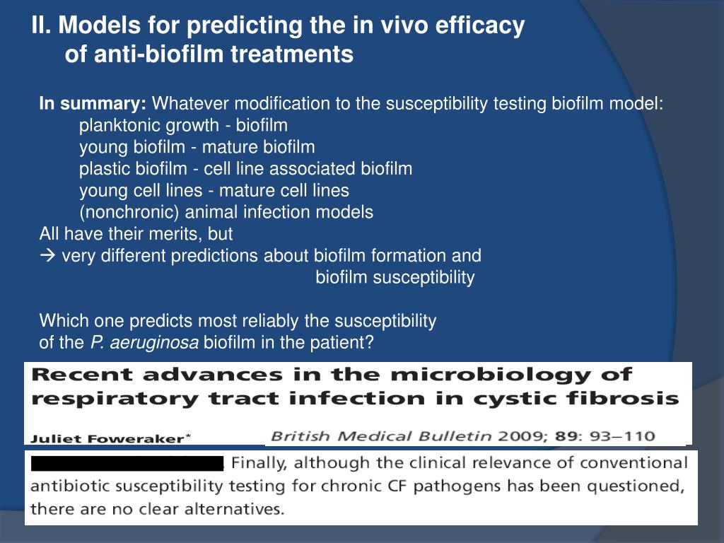 II. Models for predicting the in vivo efficacy of anti-biofilm treatments 2. Microtiter biofilm-based susceptibility testing Moskowitz et al. 2011. Ped Pulmonol 46: 184-192. Set up: 39 participants. Treated with 14-day courses of two antibiotics, that were selected on basis of diffusion antibiogram (planktonic cells) or on basis of microtiter biofilm susceptibility testing results Conclusions: In this pilot study, antibiotic regimens based on biofilm testing did not differ significantly from regimens based on conventional testing in terms of microbiological and clinical responses.