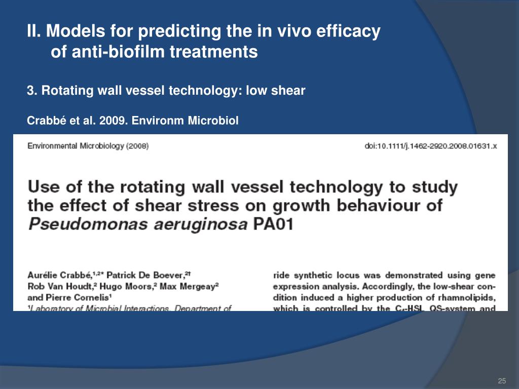 II. Models for predicting the in vivo efficacy of anti-biofilm treatments 3. Rotating wall vessel technology: low shear Crabbé et al. 2009. Environm Microbiol
