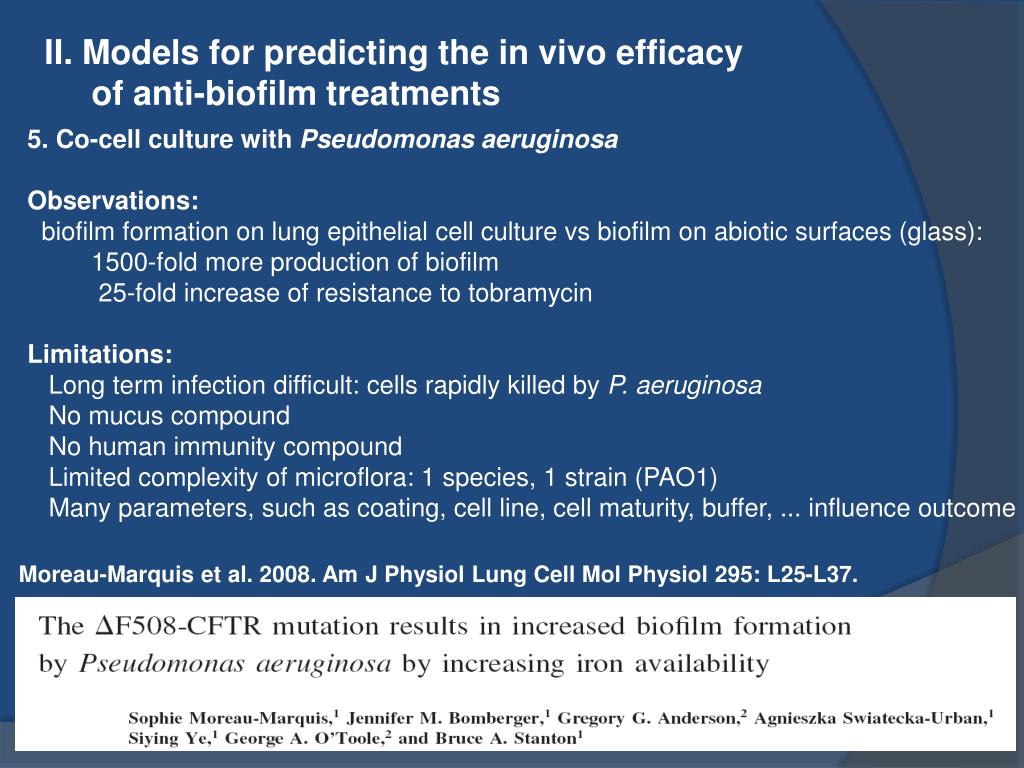 II. Models for predicting the in vivo efficacy of anti-biofilm treatments 5. Co-cell culture with Pseudomonas aeruginosa Observations: biofilm formation on lung epithelial cell culture vs biofilm on abiotic surfaces (glass): 1500-fold more production of biofilm 25-fold increase of resistance to tobramycin Limitations: Long term infection difficult: cells rapidly killed by P. aeruginosa No mucus compound No human immunity compound Limited complexity of microflora: 1 species, 1 strain (PAO1) Many parameters, such as coating, cell line, cell maturity, buffer, ... influence outcome Moreau-Marquis et al. 2008. Am J Physiol Lung Cell Mol Physiol 295: L25-L37.