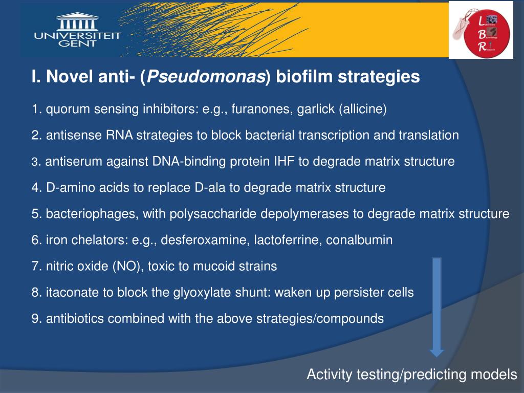 I. Novel anti- (Pseudomonas) biofilm strategies 1. quorum sensing inhibitors: e.g., furanones, garlick (allicine) 2. antisense RNA strategies to block bacterial transcription and translation 3. antiserum against DNA-binding protein IHF to degrade matrix structure 4. D-amino acids to replace D-ala to degrade matrix structure 5. bacteriophages, with polysaccharide depolymerases to degrade matrix structure 6. iron chelators: e.g., desferoxamine, lactoferrine, conalbumin 7. nitric oxide (NO), toxic to mucoid strains 8. itaconate to block the glyoxylate shunt: waken up persister cells 9. antibiotics combined with the above strategies/compounds Activity testing/predicting models