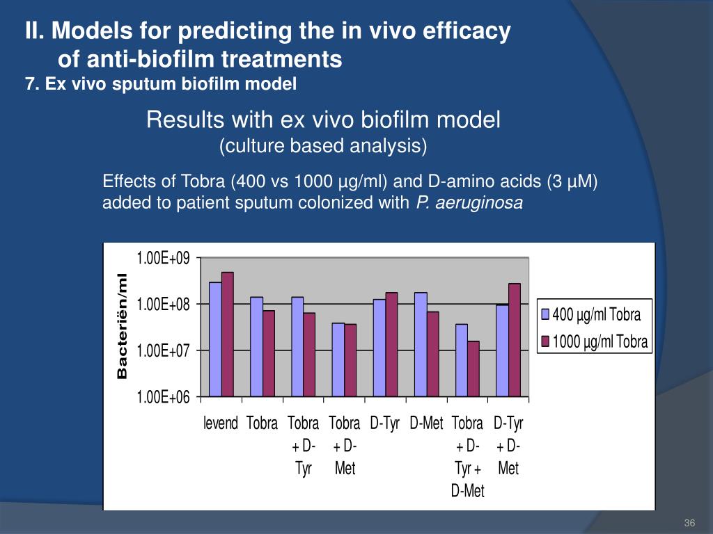 II. Models for predicting the in vivo efficacy of anti-biofilm treatments 7. Ex vivo sputum biofilm model Results with ex vivo biofilm model (culture based analysis) Effects of Tobra (400 vs 1000 µg/ml) and D-amino acids (3 µM) added to patient sputum colonized with P. aeruginosa