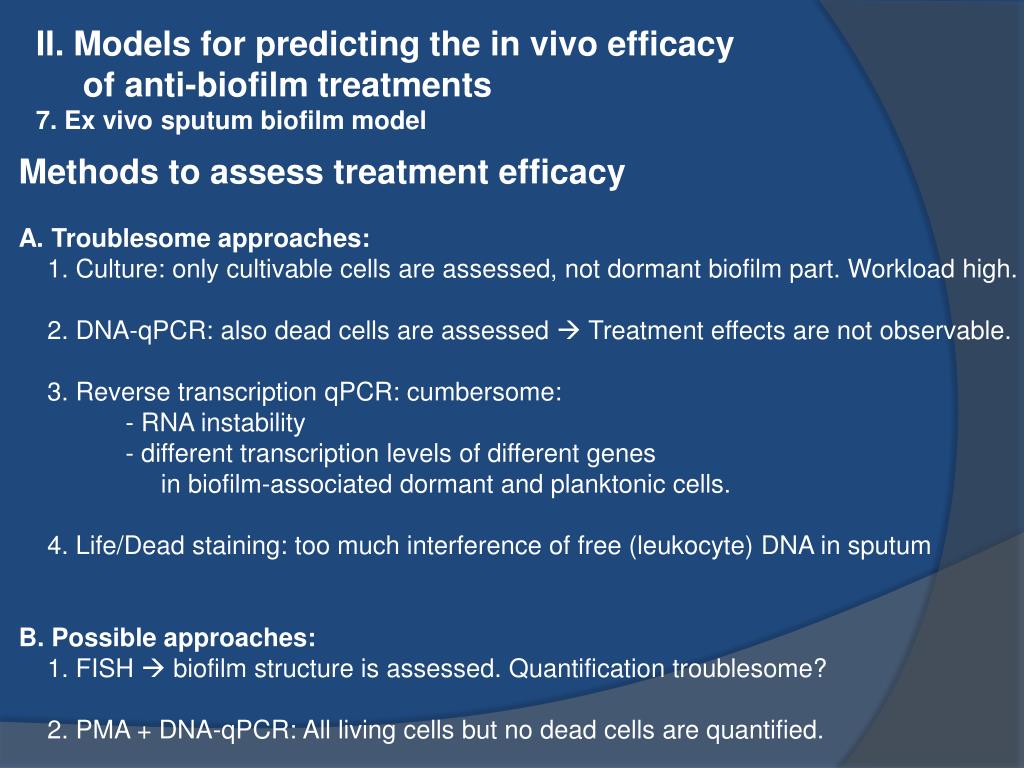 II. Models for predicting the in vivo efficacy of anti-biofilm treatments 7. Ex vivo sputum biofilm model Methods to assess treatment efficacy A. Troublesome approaches: 1. Culture: only cultivable cells are assessed, not dormant biofilm part. Workload high. 2. DNA-qPCR: also dead cells are assessed Treatment effects are not observable. 3. Reverse transcription qPCR: cumbersome: - RNA instability - different transcription levels of different genes in biofilm-associated dormant and planktonic cells. 4. Life/Dead staining: too much interference of free (leukocyte) DNA in sputum B. Possible approaches: 1. FISH biofilm structure is assessed. Quantification troublesome? 2. PMA + DNA-qPCR: All living cells but no dead cells are quantified.