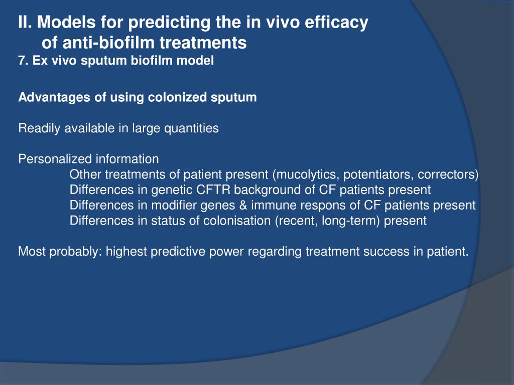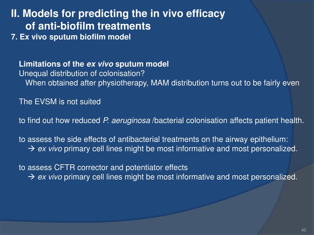 II. Models for predicting the in vivo efficacy of anti-biofilm treatments 7. Ex vivo sputum biofilm model Limitations of the ex vivo sputum model Unequal distribution of colonisation? When obtained after physiotherapy, MAM distribution turns out to be fairly even The EVSM is not suited to find out how reduced P. aeruginosa /bacterial colonisation affects patient health. to assess the side effects of antibacterial treatments on the airway epithelium: ex vivo primary cell lines might be most informative and most personalized. to assess CFTR corrector and potentiator effects ex vivo primary cell lines might be most informative and most personalized.