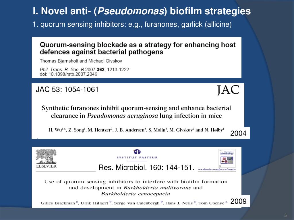 I. Novel anti- (Pseudomonas) biofilm strategies 1. quorum sensing inhibitors: e.g., furanones, garlick (allicine) JAC 53: 1054-1061 2004 Res. Microbiol. 160: 144-151. 2009