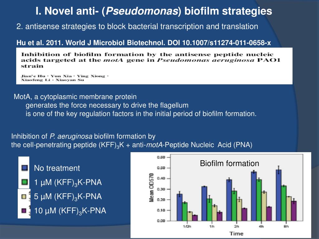 I. Novel anti- (Pseudomonas) biofilm strategies 2. antisense strategies to block bacterial transcription and translation Hu et al. 2011. World J Microbiol Biotechnol. DOI 10.1007/s11274-011-0658-x MotA, a cytoplasmic membrane protein generates the force necessary to drive the flagellum is one of the key regulation factors in the initial period of biofilm formation. Inhibition of P. aeruginosa biofilm formation by the cell-penetrating peptide (KFF)3K + anti-motA-Peptide Nucleic Acid (PNA) Biofilm formation No treatment 1 µM (KFF)3K-PNA 5 µM (KFF)3K-PNA 10 µM (KFF)3K-PNA