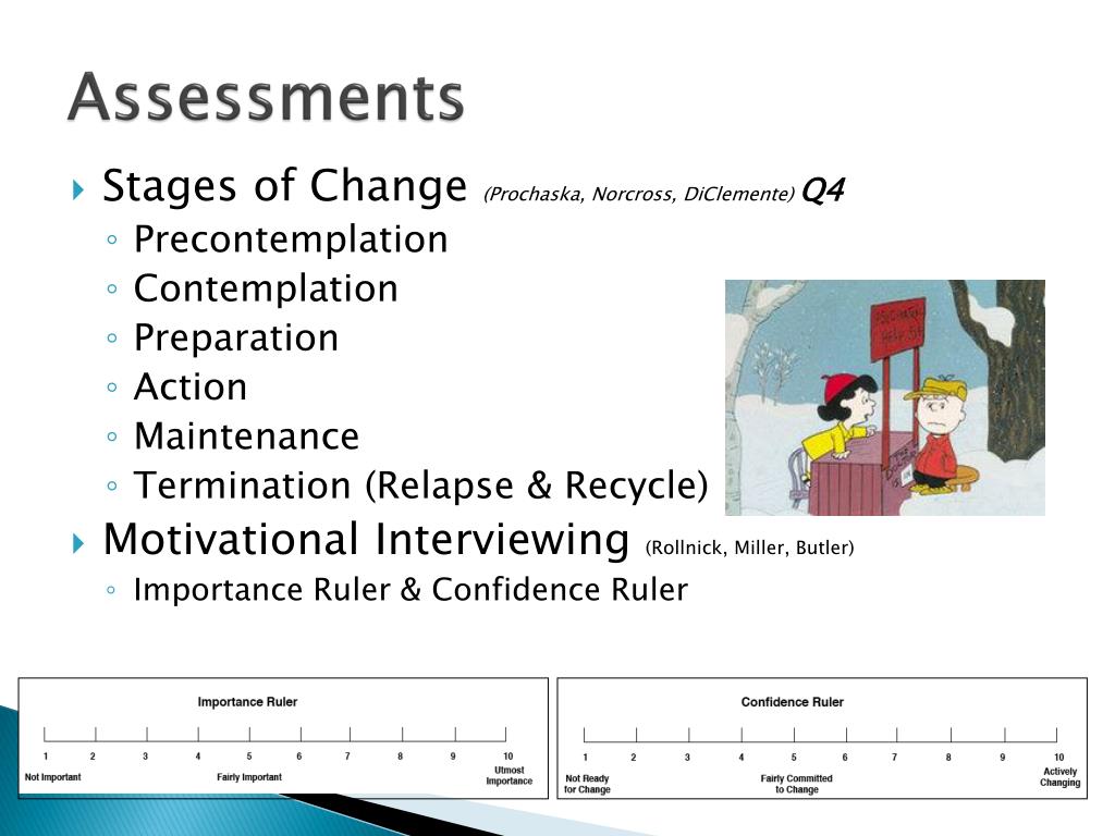 Assessments • Stages of Change (Prochaska, Norcross, DiClemente) Q4 • Precontemplation • Contemplation • Preparation • Action • Maintenance • Termination (Relapse & Recycle) • Motivational Interviewing (Rollnick, Miller, Butler) • Importance Ruler & Confidence Ruler