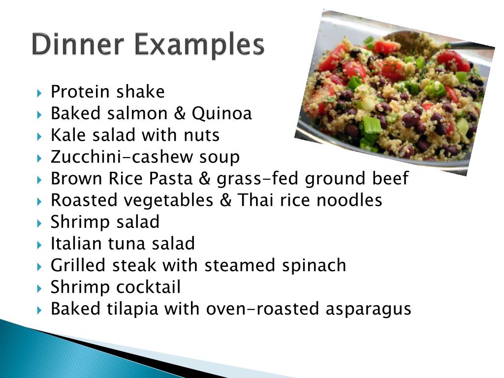 Dinner Examples • Protein shake • Baked salmon & Quinoa • Kale salad with nuts • Zucchini-cashew soup • Brown Rice Pasta & grass-fed ground beef • Roasted vegetables & Thai rice noodles • Shrimp salad • Italian tuna salad • Grilled steak with steamed spinach • Shrimp cocktail • Baked tilapia with oven-roasted asparagus