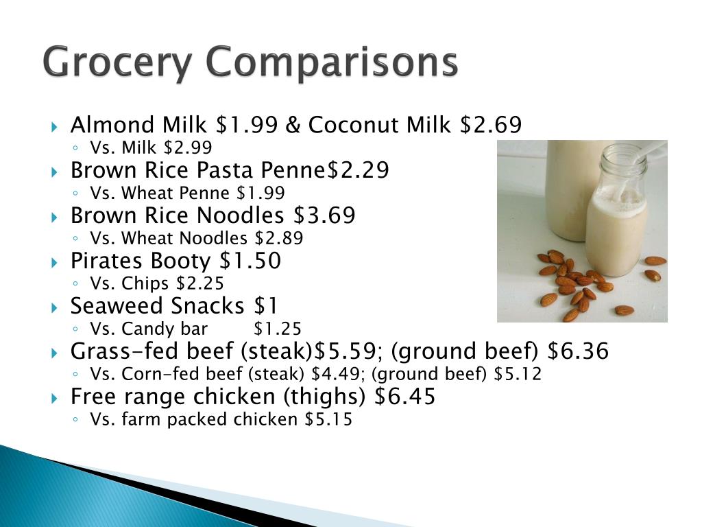 Grocery Comparisons • Almond Milk $1.99 & Coconut Milk $2.69 • Vs. Milk $2.99 • Brown Rice Pasta Penne$2.29 • Vs. Wheat Penne $1.99 • Brown Rice Noodles $3.69 • Vs. Wheat Noodles $2.89 • Pirates Booty $1.50 • Vs. Chips $2.25 • Seaweed Snacks $1 • Vs. Candy bar $1.25 • Grass-fed beef (steak)$5.59; (ground beef) $6.36 • Vs. Corn-fed beef (steak) $4.49; (ground beef) $5.12 • Free range chicken (thighs) $6.45 • Vs. farm packed chicken $5.15